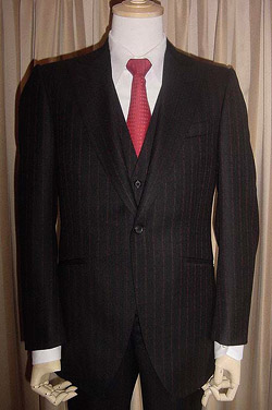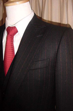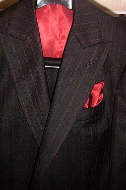 生地はvintageのSALTS。黒地に赤のストライプです。ハイゴージのピークラペルで一つボタン。フロントカットは広めのカッタウェイです。袖は気持ちフレアで、本開き重ねボタン。着丈は短め。袖付けはロープドショルダーで、がっちりした印象です。