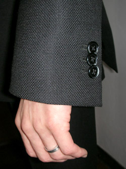 写真が判り辛いのですが、ピークのナローラペル、袖とパンツの裾は緩いフレアー。