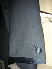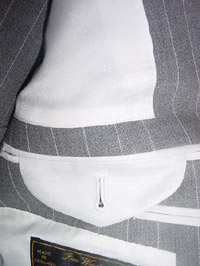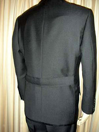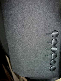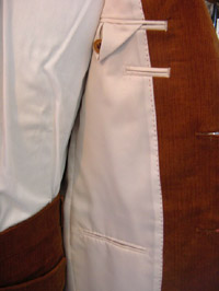 セミノッチラペル、ハイゴージ、袖釦重ね、見返しに赤のステッチを入れてあります。